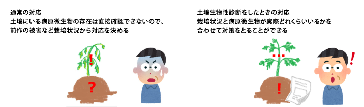作付けごとに診断し、診断の結果をみて、その後の対策に役立てることができます。病害がひどくなる前に、適切な対応をとることができ、被害を最小限にとどめることができると考えられます。